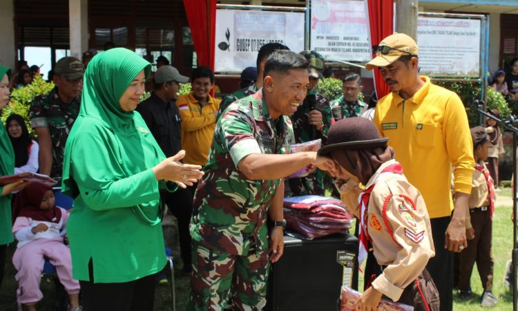 Banyuasin, CB— Komandan Kodim 0430/Banyuasin, Letkol Arh Agus Prijambodo, didampingi Ketua Persit KCK Cabang LIII Dim 0430 Ny. Beta Agus Prijambodo, menyalurkan bantuan sosial di SD Negeri 13 Muara Telang, Desa Upang Jaya, Kecamatan Muara Telang, Sabtu (4/10/2025).