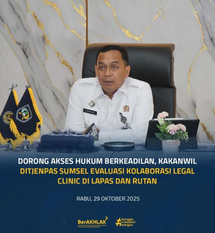 Palembang, CB – Dalam upaya memperkuat akses bantuan hukum bagi warga binaan, Kepala Kantor Wilayah Direktorat Jenderal Pemasyarakatan (Ditjenpas) Sumatera Selatan, Erwedi Supriyatno, memimpin Rapat Evaluasi Pemetaan Stakeholder dalam rangka implementasi Proyek Perubahan Legal Clinic Collaboration (LCC) di seluruh Lembaga Pemasyarakatan (Lapas) dan Rumah Tahanan Negara (Rutan) se-Sumatera Selatan, Selasa (29/10/2025).
