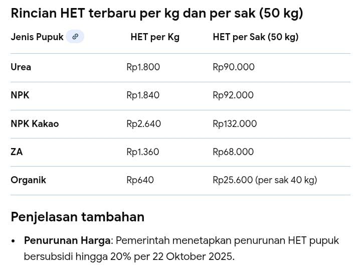Perlu diketahui per 22 Oktober 2025 Pemerintah Sudah menetapkan HET pupuk bersubsidi terbaru untuk musim tanam 2025 adalah Rp1.800/kg untuk Urea, Rp1.840/kg untuk NPK, Rp1.360/kg untuk ZA, Rp2.640/kg untuk NPK Kakao, dan Rp640/kg untuk pupuk organik. Harga per sak 50 kg untuk Urea kini Rp90.000 dan untuk NPK adalah Rp92.000, turun dari harga sebelumnya.