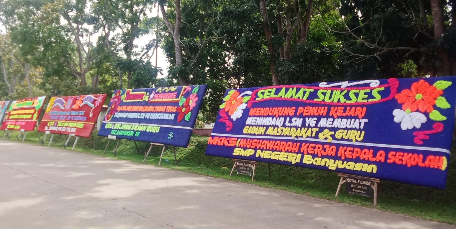 Salah satu papan bunga bertuliskan, “Mendukung Penuh Kejari Menindaki Oknum LSM yang Membuat Gaduh Masyarakat dan Guru”, Milik MKKS SMP Negeri Banyuasin.