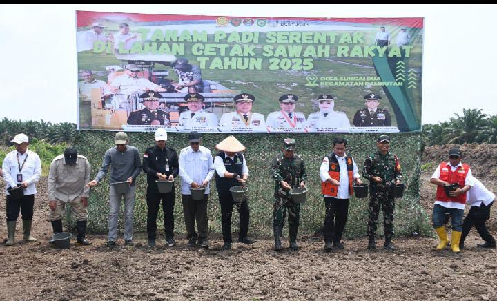 Banyuasin, CB– Upaya mendukung ketahanan pangan nasional serta optimalisasi pemanfaatan lahan pertanian, bertempat di Desa Sungai Dua, Kecamatan Rambutan, Kabupaten Banyuasin, Provinsi Sumatera Selatan, dilaksanakan kegiatan Tanam Padi di Lahan Cetak Sawah Rakyat.