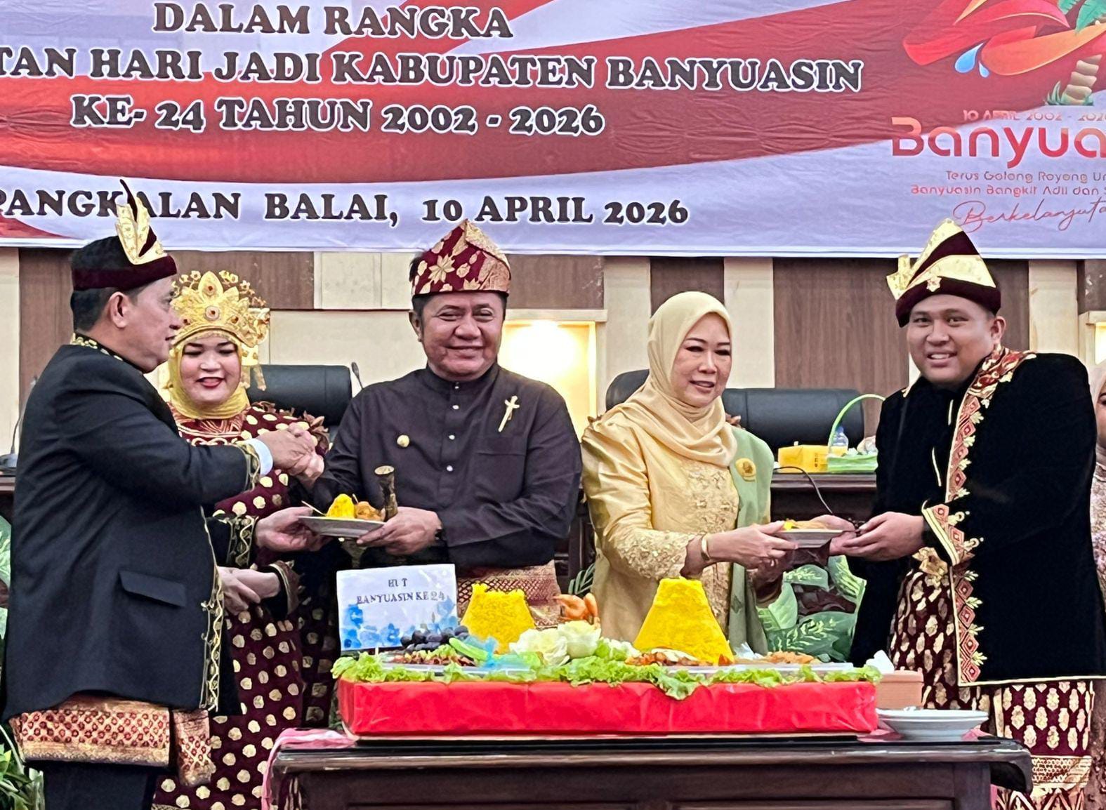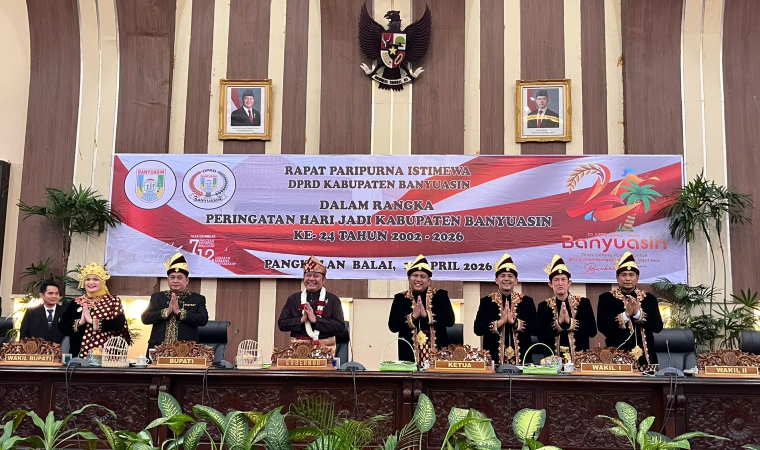 BANYUASIN, CB — Peringatan Hari Jadi Ke-24 tahun, Kabupaten Banyuasin melalui Rapat Paripurna Istimewa DPRD Banyuasin, Jumat (10/4/2026), sebagai penanda perjalanan panjang pembangunan sejak pemekaran tahun 2002.