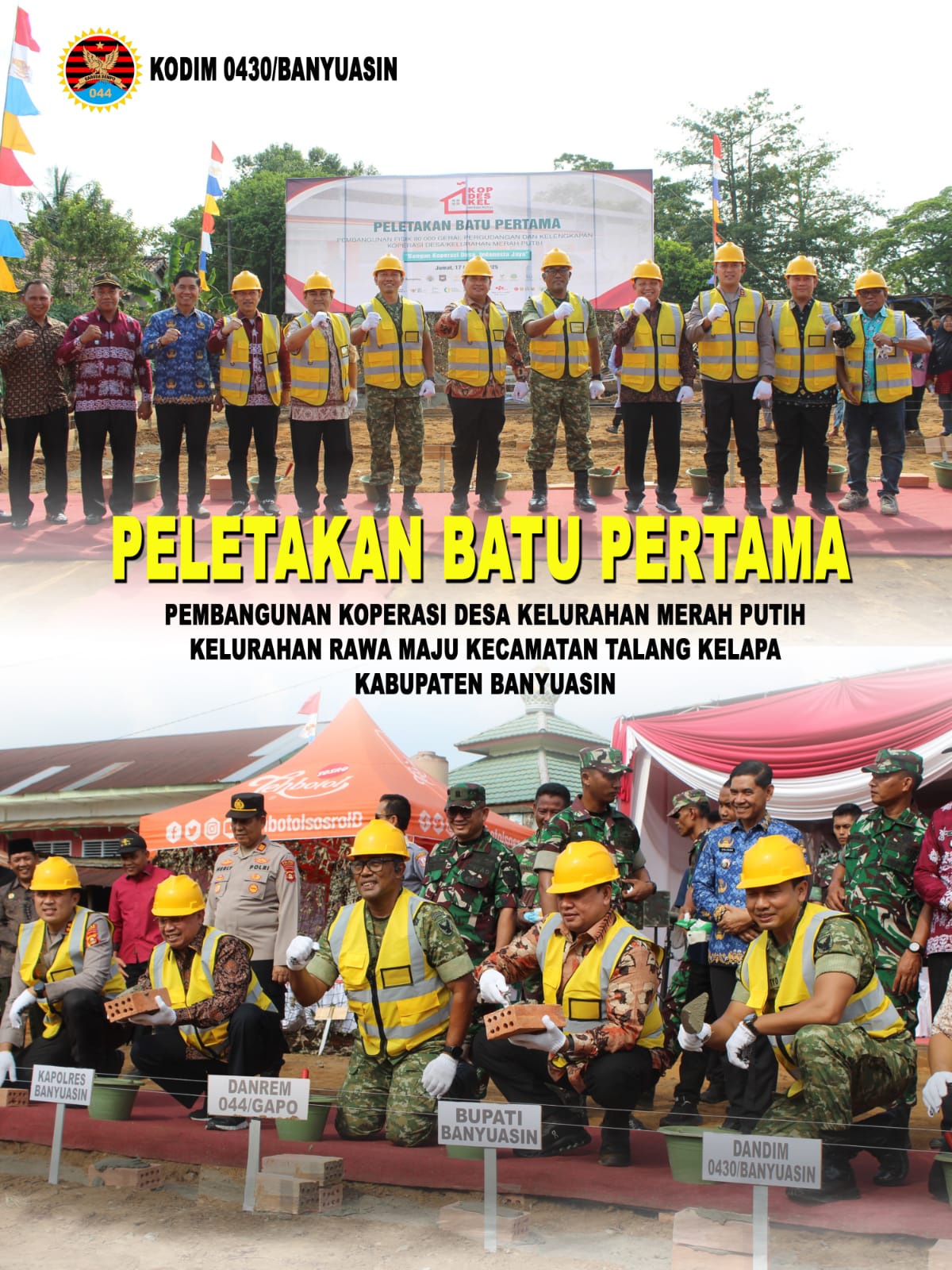 Dalam momen penuh makna tersebut, Danrem 044/Gapo Brigjen TNI Adri Koesdyanto bersama Bupati Banyuasin Dr. H. Askolani, Dandim 0430/BA Letkol Inf Handoyo Yudi Prasetyo, dan Kapolres Banyuasin AKBP Ruri Prastowo dan pejabat terkait melakukan peletakan batu pertama secara simbolis sebagai tanda dimulainya pembangunan 800 gerai koperasi tersebut.