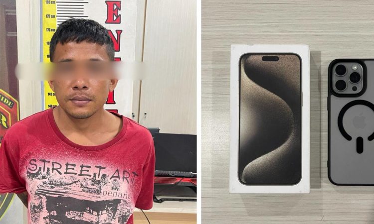 Barang bukti yang disita antara lain satu unit iPhone 15 Pro Max warna abu-abu dengan IMEI 35465091080578 dan satu unit Yamaha Vega ZR warna hitam yang digunakan saat beraksi.