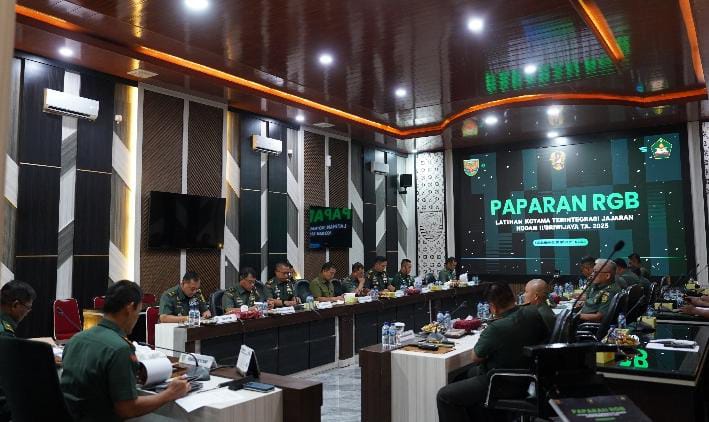 Panglima Komando Daerah Militer II/Sriwijaya, Mayjen TNI Ujang Darwis, M.D.A., memimpin Paparan Rencana Garis Besar (RGB) Latihan Kotama Terintegrasi Jajaran Kodam II/Sriwijaya Tahun Anggaran 2025 yang disampaikan oleh Komandan Rindam II/Sriwijaya, Brigjen TNI Lalu Habibburahim Wiradarma, S.I.P., M.Si., M.Han. bertempat di Gedung Puskodalopsdam II/Sriwijaya. Senin (10/11/2025)